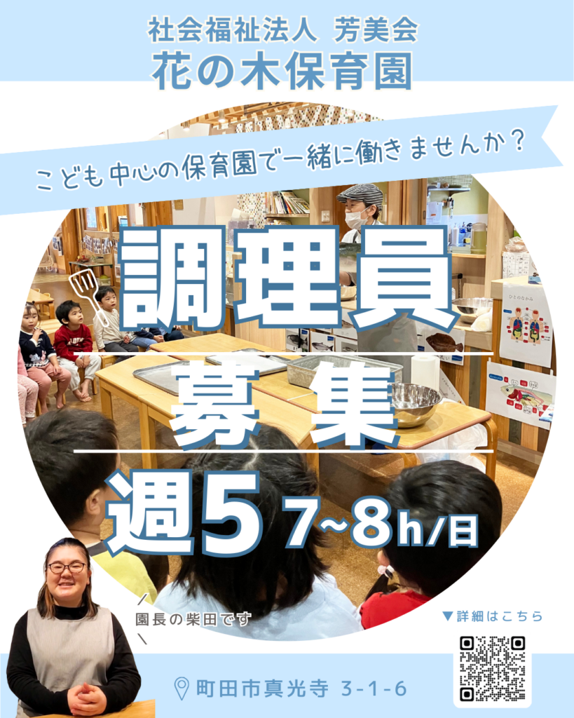 社会福祉法人 芳美会が運営する花の木保育園では、園児・職員向けの給食調理を担当する 調理スタッフ(準正規職員) を募集しています。